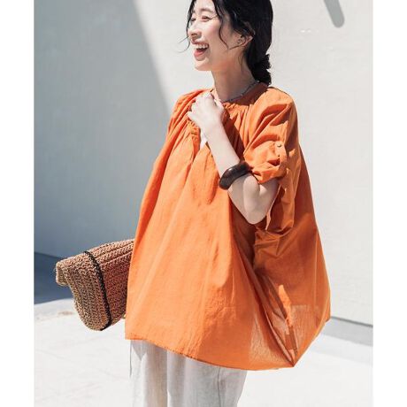 軽く清涼感のあるコットンボイル生地を使用したブラウスは、肩まわりや袖にかけてたっぷり入ったギャザーが程よいボリュームを出してくれるアイテム。