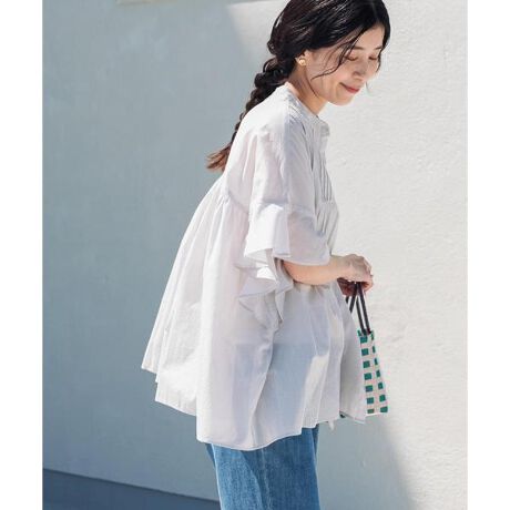 フロントに施したピンタックと、動きのあるフレアスリーブが一枚で着映えする仕上がり。