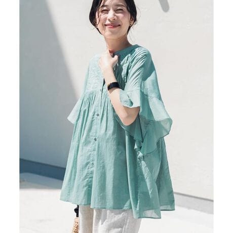 フロントに施したピンタックと、動きのあるフレアスリーブが一枚で着映えする仕上がり。