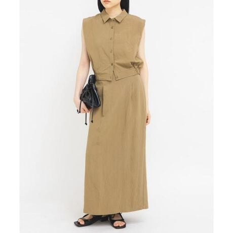 バックにフォルムとボリュームを持たせたスリーブレスシャツと、IラインシルエットのスカートがSETになった着回し力の高いアイテム。SETで着ていただくと女性らしい雰囲気に仕上がり、インナーにTシャツを入れると少しカジュアルにもなります。別々でも着回せるので、様々なスタイリングが楽しめる1着です。