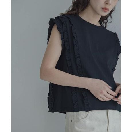 身頃と袖口のフリルが大人かわいいを演出するデザイントップス。