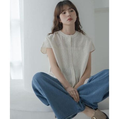 繊細な刺繍柄を施したコットンレースを使用したブラウス。