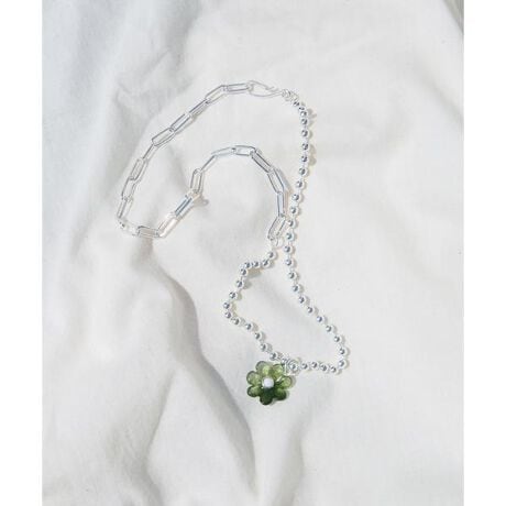シルバーのクリーンな質感と、深みのあるグリーンのフラワーモチーフが絶妙なバランスで、可愛らしくなりすぎず都会的な印象に仕上げてくれます。