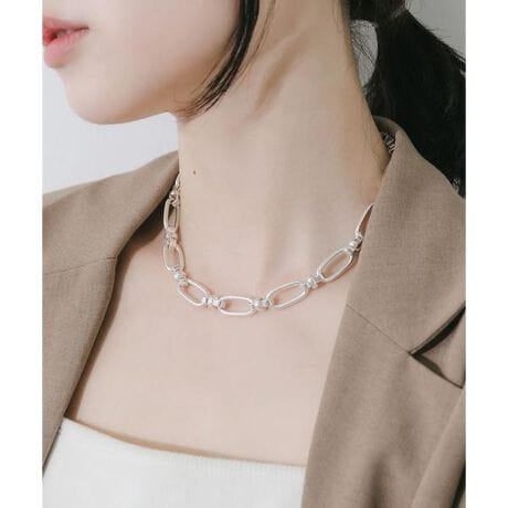 顔周りで存在感を放つ、モダンなシルエットのチェーンネックレス。