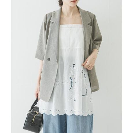 フロントや裾にあしらわれた繊細なカットワーク刺繍が、大人の甘さを引き立てる洗練されたディテール。裾に向かって緩やかに広がるAラインシルエットにより、レイヤードスタイルも重たくならず、夏らしい抜け感を演出します。