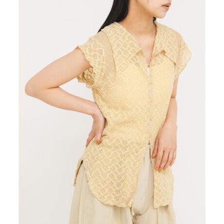 甘めのレースを襟付きのシャツに落とし込んだデザイントップス。二の腕を程よくカバーしてくれるフレンチスリーブ、抜け感をプラスするレースの透け感が特徴的です。前開き部分はキーネックにもなるので首元がすっきりと見えます。また、細身のシルエットはボリュームボトムと相性が良くバランス良く仕上がります。