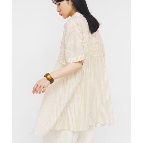 胸元のシャーリングデザインが目を惹くミニワンピース。程よく透け感があるストライプ柄を使用しており、暑い時期でも清涼感のある印象を与えます。甘い印象ですが、袖口を折り返したようなディテールがカジュアルさをプラスします。