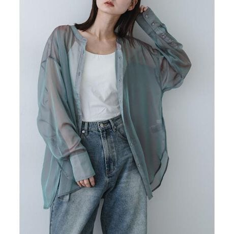 日常の装いに、涼やかな光と透明感を運んでくれるシアーバンドカラーシャツ。繊細な光沢を放つ生地が、カジュアルな着こなしをクラスアップさせ、モダンな佇まいへと導きます。前を閉じてプルオーバーのように着こなすのはもちろん、ノースリーブの上からさらりと羽織るスタイルもおすすめ。日除けや冷房対策としても重宝する軽快な着心地は、アクティブに過ごしたい夏のワードローブに欠かせない、完成度の高い特別な一品です。