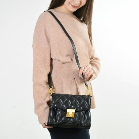 金色の金具とキルティングデザインのアクセントが高級感を演出する2wayレザーハンドバッグ。ポケットが3層に分かれているので綺麗の収納できます。チェーンのハンドルの他に付属のショルダーベルトが付いており、気分を変えてお持ちいただけます。