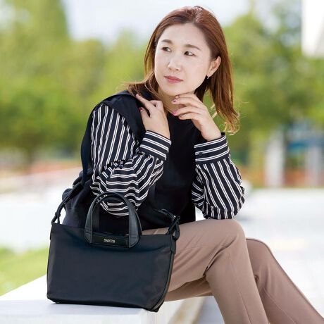 ベーシックなデザインで使いやすいすこし小ぶりなナイロントートバッグ。