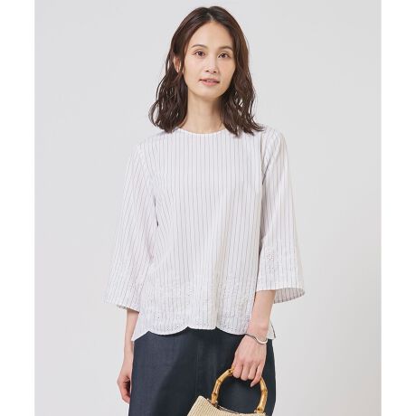 ■デザイン繊細なレース調の刺繍が目を惹く、クルーネックブラウス。 裾と袖口にあしらわれた刺繍が、ストライプ柄に上品な華やかさをプラスした1着。袖口に向かって広がる7分袖のデザインは、動くたびにきれいなシルエットを演出してくれます。春の空気を纏ったような、軽やかさを楽しめるアイテムです。カラーは、清涼感がありやさしい印象を与えるホワイト×ネイビー(#101)、顔周りを明るく彩るイエロー×ホワイト(#142)、知的で爽やかな印象を与えるネイビー×ホワイト(#175)の3色展開です。