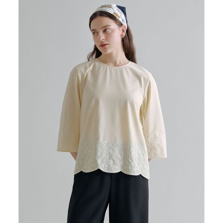 春の空気に似合う、繊細なレース刺繍がポイントのクルーネックブラウス