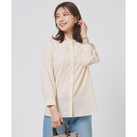 ■デザイン前身頃にあしらわれた繊細なレース調の刺繍が、上品で華やかなアクセントをプラスするバンドカラーブラウス。顔周りを明るく見せ、大人の女性に似合う洗練されたデザインに仕上げました。一枚着としてはもちろん、前を開けてTシャツなどの上にさらりと羽織れば、休日のカジュアルスタイルも上品に決まります。カラーは、清涼感がありやさしい印象を与えるホワイト×ネイビー(#101)、顔周りを明るく彩るイエロー×ホワイト(#142)、知的で爽やかな印象を与えるネイビー×ホワイト(#175)の3色展開です。