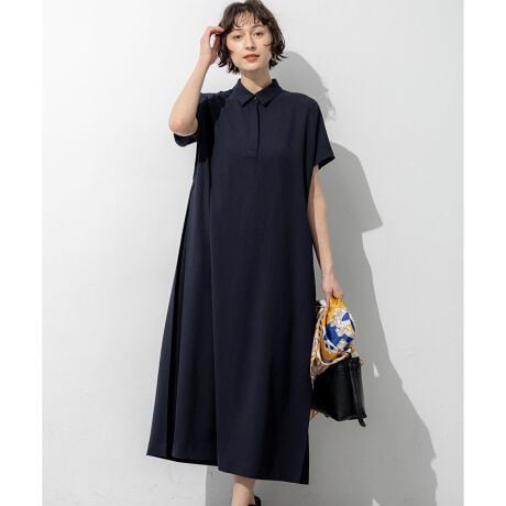 糸に凹凸感を持たせることで、肌にまとわりつきにくく、さらりとした快適な着心地を実現したウールのような上品な表情を持つ素材を使用しています。日本の合繊産地である北陸地方で丁寧に加工を施しており、薄手でありながらも程よいハリ感を持たせているため、ワンピースの美しいシルエットをしっかりとキープします。軽やかさと仕立て映えする上質な素材感が魅力です。