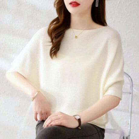 ボートネックが顔まわりをすっきりと見せてくれる、半袖ドルマンニットトップス。