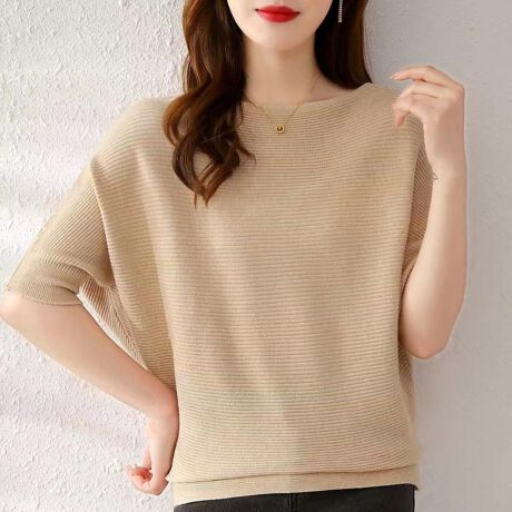 ボートネックとドルマンシルエットで抜け感を演出、スプリングニット。 半袖ニットトップス ボートネック