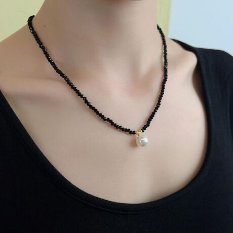 小さなブラックビーズに、ひと粒パールを合わせたネックレス。