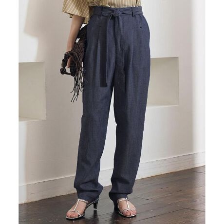 きれいめにもカジュアルにも合わせやすい着回し力で選ぶテーパードパンツ■デザイン2タックを入れた、きれいめな印象のテーパードパンツです。気になる太ももまわりには程よくゆとりを持たせ、膝位置から裾にかけてすっきりと細くなるシルエットで、さまざまなスタイリングに取り入れやすい一本に仕上げました。ウエストは3/4ゴム仕様で、見た目のきちんと感と快適な履き心地を両立。コットンリネン素材ながらシワが気になりにくく、ドライで表情のある組織がデニムライクなカジュアルさを演出し、春夏シーズンに活躍します。ウエストリボン付きで、お好みでアクセントとしてお使いいただけます。■素材コットンリネンの混紡糸を使用したツイル素材です。リネン混ならではのナチュラルな節感が、天然素材らしい風合いを表現しています。デニム見えのカジュアルな素材で、色落ちを気にせず着用できるのも嬉しいポイント。水洗い可能で、接触冷感機能を備えています。