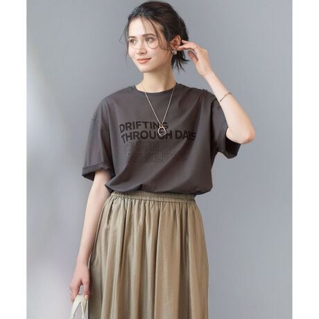 ヒップまでかかるレングスと肘上の袖丈が、今年らしいゆったりとしたリラックス感のあるロゴTシャツ。エアリーフレアスカート のようなボリュームのあるボトムスに、裾をアウトにして頂くスタイリングがおすすめです。フロントには「DRIFTING THROUGH DAYS OF SUN AND SILENCE(太陽と静けさの中をただ漂う日々)」という、夏らしい余韻を感じさせるフレーズのロゴを4段に配置し、大人のカジュアルスタイルに寄り添うアクセントを効かせました。カラーは、ベーシックで着回しやすいオフホワイト×ブラック(#001)、柔らかなニュアンスのモカ×ブラック(#030)、こなれた印象を与えるスチール×ブラック(#004)の3色展開です。
