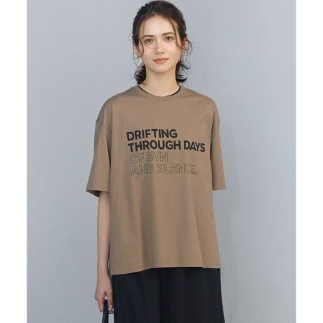 ヒップまでかかるレングスと肘上の袖丈が、今年らしいゆったりとしたリラックス感のあるロゴTシャツ。エアリーフレアスカート のようなボリュームのあるボトムスに、裾をアウトにして頂くスタイリングがおすすめです。フロントには「DRIFTING THROUGH DAYS OF SUN AND SILENCE(太陽と静けさの中をただ漂う日々)」という、夏らしい余韻を感じさせるフレーズのロゴを4段に配置し、大人のカジュアルスタイルに寄り添うアクセントを効かせました。カラーは、ベーシックで着回しやすいオフホワイト×ブラック(#001)、柔らかなニュアンスのモカ×ブラック(#030)、こなれた印象を与えるスチール×ブラック(#004)の3色展開です。