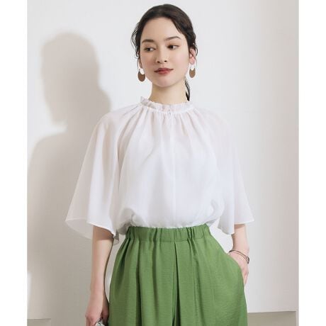定番人気のリヨセルポプリンシリーズに新型が登場きちんと感と涼やかさを纏うフェミニンブラウス■デザイン衿ぐりに施した小さめのフリルディテールが、顔まわりを華やかに演出するプルオーバーブラウスです。ラグランスリーブで切り替えた袖は、肩から流れるようなフレアシルエットが女性らしい印象に。ボディラインを拾いにくい、程よくゆとりのあるシルエットで、しなやかな素材ならではの美しいドレープ感が柔らかなフェミニンさを引き立てます。シンプルなボトムと合わせるだけで、涼しげで華やかなスタイリングが完成します。衿ぐりのキーネック部分にはホックを2つ付けており、すべて外した着こなしはもちろん、留めてきちんと感のある着用も可能です。■素材しなやかな風合いと程よい光沢感、美しいドレープ性が特徴の素材です。さらりとしたタッチで、接触冷感、UVケア、抗菌防臭の機能付きです。■同素材シャツ(BLW7CA0011)ワンピース(OPW7GM0509)