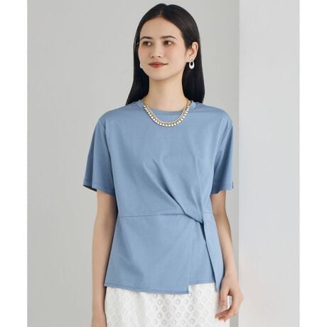 ひねりの効いたディテールでシンプルでも差がつくトップス■デザイン今シーズンのキーディテールであるツイストを施したデザインTシャツです。ツイスト部分は肌が見えすぎないよう工夫し、一枚でも着用しやすいシルエットに仕上げています。ウエスト付近に施したデザインは、ジャケットなどを羽織った際もドレープがきれいに残り、スタイリングのアクセントになるインナーとしても活躍します。■素材表側に50番手コットン、裏側にポリエステルを使用して編み立てたプレーティング天竺素材です。コンパクトで美しい目面と透けにくさ、さらっとした肌触りの良さが特徴で、快適な着心地を叶えます。