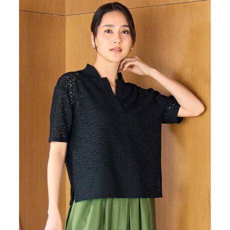 デイリーにも通勤にも、洗練のベーシックカラーで楽しむ上品スキッパー■デザイントレンドのスキッパーデザインをレース素材で表現した、上品な衿付きジャージートップスです。ジャージーならではの気軽な着心地を持ちながら、華やかさも兼ね備えた一枚に仕上げています。飽きのこないベーシックなカラー展開で、デイリーから通勤まで幅広いシーンで活躍します。■素材太さや光沢の異なるポリエステル糸を使用し、落下板ラッセル機で編み立てることで柄の凹凸感を表現したレース素材です。さらに、生地に膨らみと伸縮性を持たせる仕上げ加工を施し、快適な着心地を実現しています。幾何学調のフラワーモチーフは甘くなりすぎず、見た目の鮮やかさと着用感の良さを両立。国内で生産されたレース素材を使用しています。