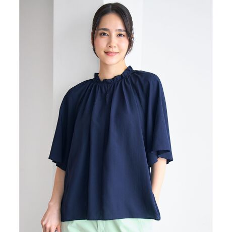 定番人気のリヨセルポプリンシリーズに新型が登場きちんと感と涼やかさを纏うフェミニンブラウス■デザイン衿ぐりに施した小さめのフリルディテールが、顔まわりを華やかに演出するプルオーバーブラウスです。ラグランスリーブで切り替えた袖は、肩から流れるようなフレアシルエットが女性らしい印象に。ボディラインを拾いにくい、程よくゆとりのあるシルエットで、しなやかな素材ならではの美しいドレープ感が柔らかなフェミニンさを引き立てます。シンプルなボトムと合わせるだけで、涼しげで華やかなスタイリングが完成します。衿ぐりのキーネック部分にはホックを2つ付けており、すべて外した着こなしはもちろん、留めてきちんと感のある着用も可能です。■素材しなやかな風合いと程よい光沢感、美しいドレープ性が特徴の素材です。さらりとしたタッチで、接触冷感、UVケア、抗菌防臭の機能付きです。■同素材シャツ(BLWRCA0011)ワンピース(OPWRGM0509)