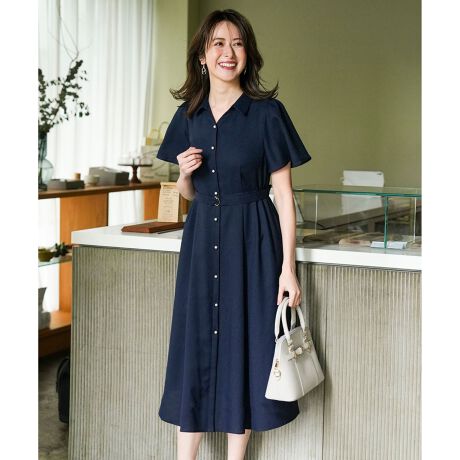 ・1枚でスタイリングが完成し、さまざまなシーンに対応できるほどよいきれいめデザイン・美しいフィット&フレアシルエットが着映えするワンピース・シャツカラーで程よいきちんと感・パール調ボタンが涼しげで上品なアクセント・腕周りをカバーしやすいデザイン