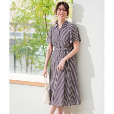 ・1枚でスタイリングが完成し、さまざまなシーンに対応できるほどよいきれいめデザイン・美しいフィット&フレアシルエットが着映えするワンピース・シャツカラーで程よいきちんと感・パール調ボタンが涼しげで上品なアクセント・腕周りをカバーしやすいデザイン