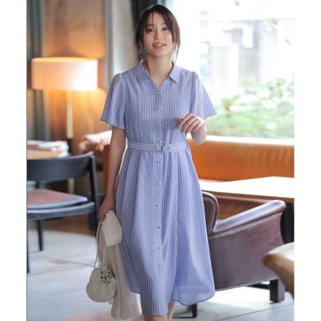 ・1枚でスタイリングが完成し、さまざまなシーンに対応できるほどよいきれいめデザイン・美しいフィット&フレアシルエットが着映えするワンピース・シャツカラーで程よいきちんと感・パール調ボタンが涼しげで上品なアクセント・腕周りをカバーしやすいデザイン