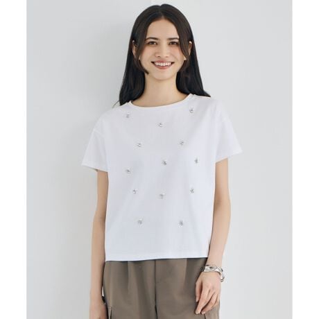 着るだけで完成するビジューが主役のデザインTシャツ■デザインやや大粒のビジューをあしらった、印象的なデザインTシャツです。程よく肌から離れるシルエットで、ボトムのシルエットを選ばず着用いただけます。一枚でスタイリングに華やかさを添えてくれる、単品映えするアイテムです。デニム合わせのカジュアルスタイルから、きれいめボトムとのコーディネートもおすすめです。■素材ポリエステルと綿を使用した、適度なハリ感のあるポンチ素材です。綿の肌触りの良さを残しながらシルケット加工を施すことで、上品な風合いに仕上げています。