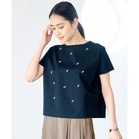 着るだけで完成するビジューが主役のデザインTシャツ■デザインやや大粒のビジューをあしらった、印象的なデザインTシャツです。程よく肌から離れるシルエットで、ボトムのシルエットを選ばず着用いただけます。一枚でスタイリングに華やかさを添えてくれる、単品映えするアイテムです。デニム合わせのカジュアルスタイルから、きれいめボトムとのコーディネートもおすすめです。■素材ポリエステルと綿を使用した、適度なハリ感のあるポンチ素材です。綿の肌触りの良さを残しながらシルケット加工を施すことで、上品な風合いに仕上げています。