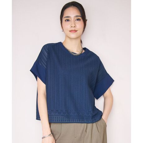 計算いらずで着映えるインナー付きレースプルオーバー■デザインオリジナルの総レースを使用した、繊細な表情のレースプルオーバーです。襟と袖口に無地生地を施すことで、ブラウスのような上品さをプラスしました。インナーのタンクトップがセットになっているため、涼しげな透け感がありながらも、肌の露出を抑えて安心して着用いただけます。程よくバランスの取れたクロップド丈で、スカートにはすっきりと、パンツにはきちんとした印象で合わせられる一枚です。デニムと合わせた、きれいめカジュアルなスタイリングもおすすめです。■素材総柄レースのプルオーバーは、ドイツ製の編機を使用し自由区オリジナルの柄を時間をかけて丁寧に編み上げました。3種類の異なるポリエステル糸を使用することで、ナチュラルな表情に仕上げています。インナーのタンクトップは、綿の持つ肌触りの良さに加えてシルケット加工を施し、上品な光沢と程よいハリ感を持たせた素材です。