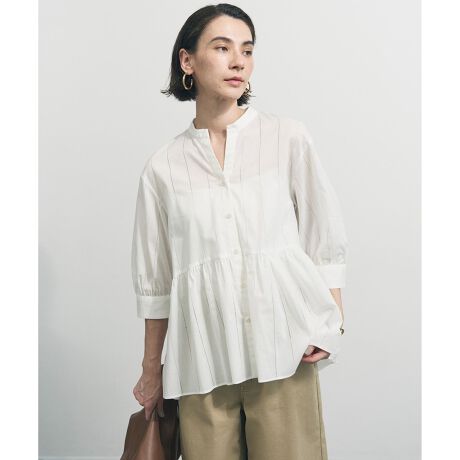 ■デザインふわっと揺れるギャザーが目を惹くペプラムブラウス。顔周りをすっきり見せるV開きのバンドカラーと軽やかな素材感で、甘い印象になりすぎず大人の女性らしい印象に。ボタンを開けて羽織りとしても着用できるので、着回しの幅も広がります。一点取り入れるだけでコーディネートが華やぐ、着映えブラウスです。