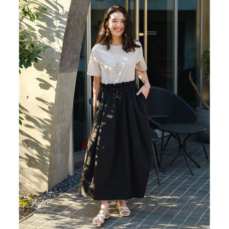 ■デザインTシャツとスカートのセットアップ風デザインが特徴のワンピース。ウエストのフリルやドロストデザインがアクセントとなり、太ゴム入りでストレスフリーな着心地を実現します。スカートはコクーンシルエットで、着るだけでこなれ感のあるスタイルに仕上がります。ドロスト位置の調整により、着丈やシルエットの変更が可能です。1枚でコーディネートが完成するので、忙しい朝や旅行などのシーンに大活躍します。スニーカーやサンダルと合わせたカジュアルな着こなしはもちろん、きれいめな小物を合わせればちょっとしたお出かけにもぴったりです。便利なポケット付きなのも嬉しいポイントです。