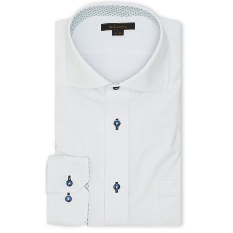 夏場のクールビズに大活躍してくれる、長袖のニットシャツです。衿型はノータイでのオフィスカジュアルに最適なカッタウェイを採用。剣先が外に大きく開いていて、衿が目立たずスッキリとした印象です。衿台・カフス裏の別生地とカラー釦がアクセントになっています。