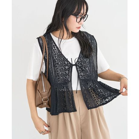 取り入れるだけで普段のスタイルが瞬時に格上げ繊細なレース使いとインド製の落ち着いた風合いが普段のコーデを格上げしてくれます。フロントリボンは結び方で印象を変えられ、少し開けて抜け感を出したりきちんと結んでフェミニンに仕上げたりできます。ウエスト下のフレアギャザーが自然なドレープを作りボディラインをきれいに見せます。薄手で通気性が良く重ねてもかさばらないので季節の変わり目に重宝します。顔まわりをすっきり見せるVネックラインと程よい着丈でハイウエストボトムにもバランスよく合い、カジュアルシャツやニットとの重ね着でこなれたスタイルが完成します。細やかなレースは光の透けで表情が変わり一枚でも存在感があり、簡単にレイヤードスタイルが完成するアイテムとなります。透け感[あり]