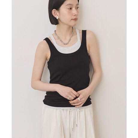 デザインの異なる2枚のタンクトップをレイヤードした、こなれ感のあるアイテム。肩のラインが重なることでデコルテがすっきり見え、1枚でもサマになる美しいシルエットが魅力です。柔らかな綿100%素材で2枚重ねても重たくならず、夏場もさらりと快適に着用いただけます。シャツやメッシュトップスのインナーに合わせるだけで、ワンランク上のスタイリングに。