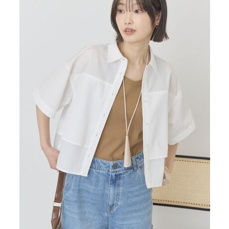 身頃がレイヤードされた様なデザインのハーフスリーブシャツ。やや短めの着丈とゆったりしたボックスシルエットで、シンプルながら抜け感のある着こなしに仕上がります。ワイドボトムと相性が良く、デイリーからきれいめまで幅広く活躍するアイテムです。