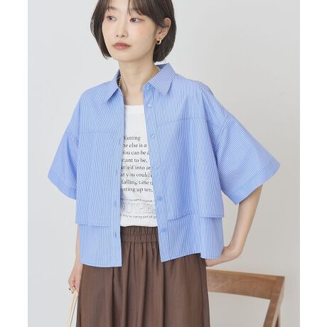 身頃がレイヤードされた様なデザインのハーフスリーブシャツ。やや短めの着丈とゆったりしたボックスシルエットで、シンプルながら抜け感のある着こなしに仕上がります。ワイドボトムと相性が良く、デイリーからきれいめまで幅広く活躍するアイテムです。