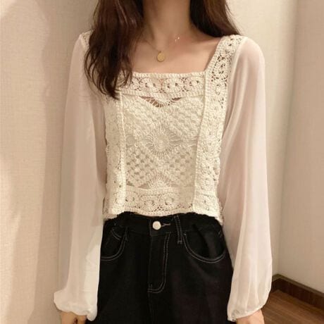 -繊細なレースデザインとシフォン袖が女性らしさを引き立てるブラウス。