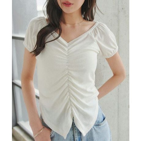 フロントギャザーが女性らしい立体感を演出し、1枚で着映えが叶うTシャツ。