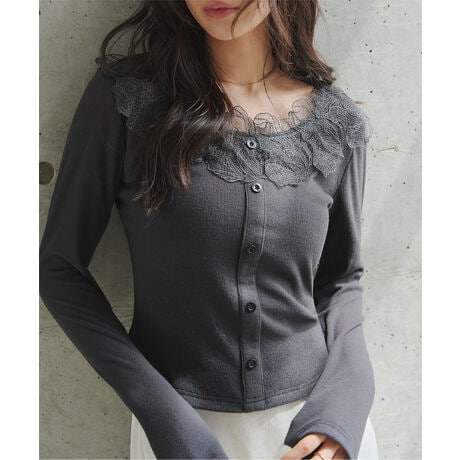上品で立体感のあるシアーレースがお顔周りを華やかに女性らしさ引き立てるデザインロンT。