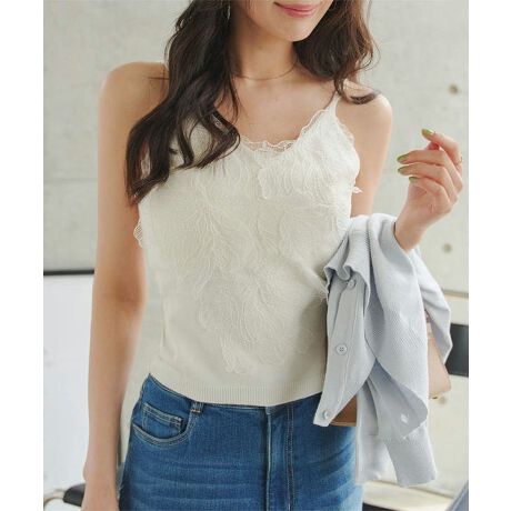 身頃に立体感あるレースを大胆にあしらったレースニットキャミソール。