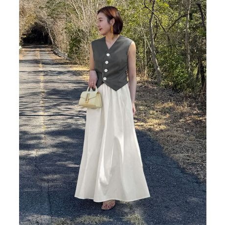 マニッシュでコンパクトなサイズ感のジレと、歩くたびに揺れるマキシ丈のギャザースカートはセットアップはもちろん、それぞれ単品でも使える着回し力抜群のアイテムです。