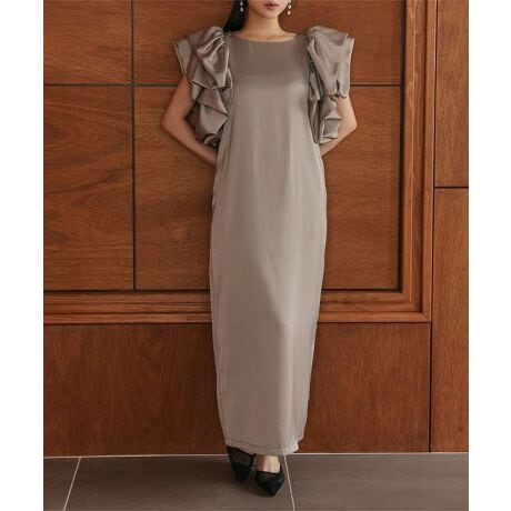 立体感たっぷりのバルーンフリルスリーブが目を惹き、1枚で華やかな存在感を放つドレス。