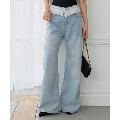 ウエストレースで甘さを添えたワイドデニムパンツ。