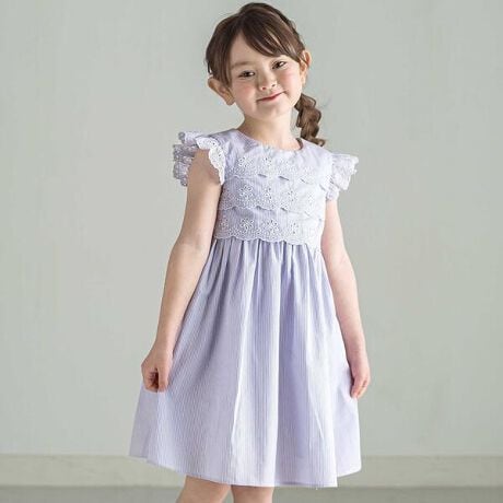 胸元とフリル袖に使用された繊細なレースが華やかな女の子用ワンピースです。