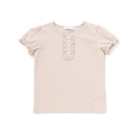 縁にフリルをあしらった前立てにパールの飾りボタンを配したパフスリーブTシャツです。